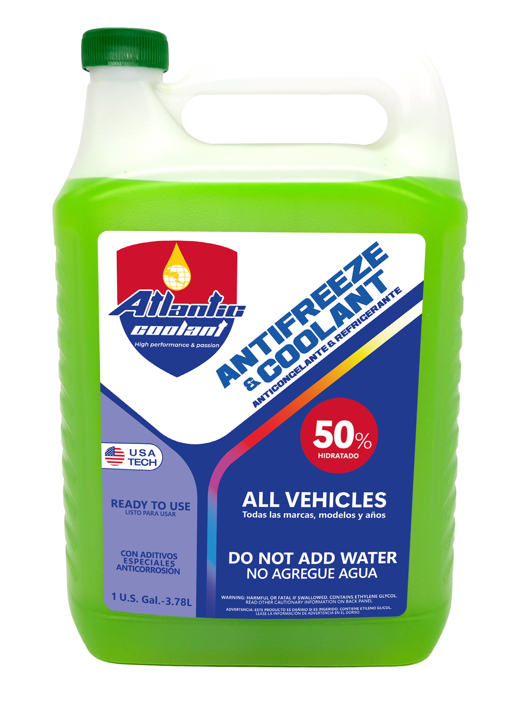 El Atlantic Coolant 50% es un anticongelante y refrigerante premium listo para usar, compatible con todas las marcas y modelos de vehículos. 🔹 Contiene 50% de etilenglicol, brindando máxima protección contra el sobrecalentamiento y la corrosión. 🔹 Formulado con tecnología USA Tech y aditivos anticorrosivos especiales. 🔹 No necesita diluirse con agua, ideal para climas exigentes y motores de alto rendimiento.